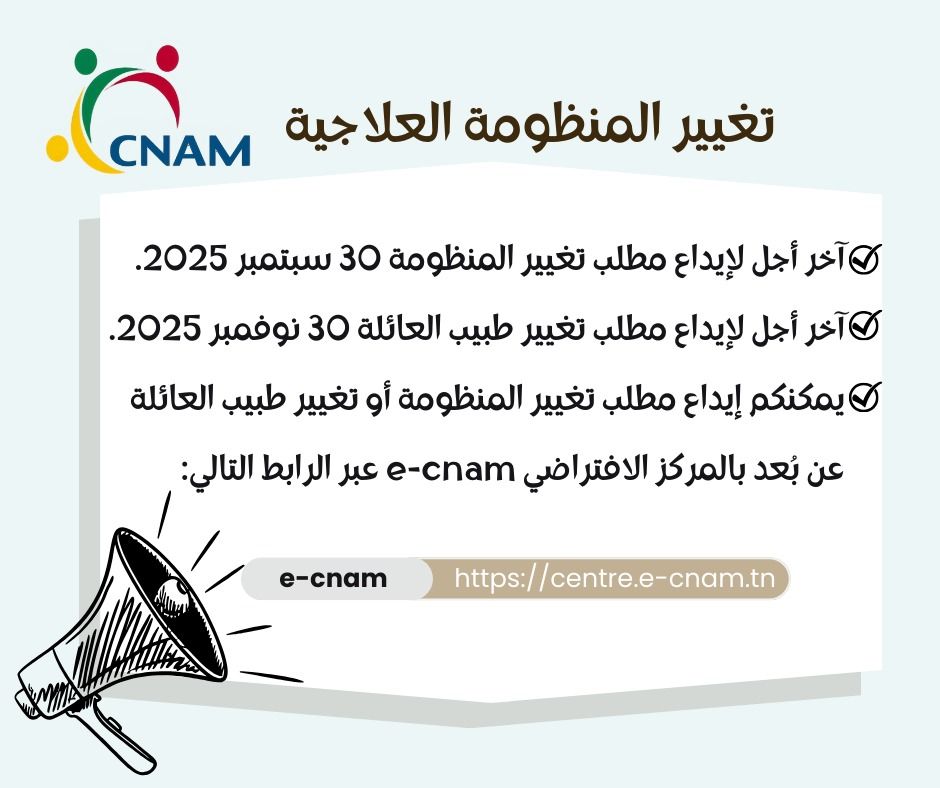 ويمكن إيداع مطلب تغيير منظومة العلاج أو تغيير طبيب العائلة عن بُعد بالمركز الافتراضي e-cnam عبر الرابط https://centre.e-cnam.tn