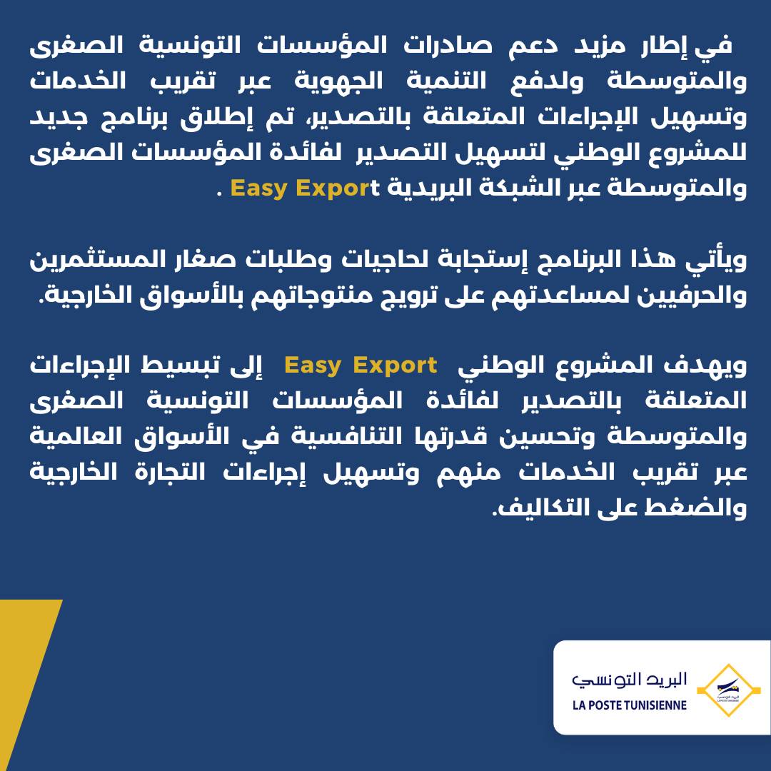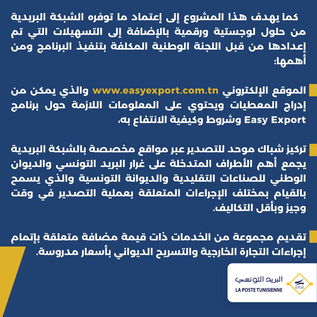 كما يهدف إلى إعتماد ما توفره الشبكة البريدية من حلول لوجستية ورقمية بالإضافة إلى التسهيلات التي تم إعدادها من قبل اللجنة الوطنية المكلفة بتنفيذ البرنامج على غرار الموقع الإلكتروني www.easyexport.com.tn والذي يمكن من إدراج المعطيات ويحتوي على المعلومات اللازمة حول برنامج Easy Export وشروط وكيفية الانتفاع به.