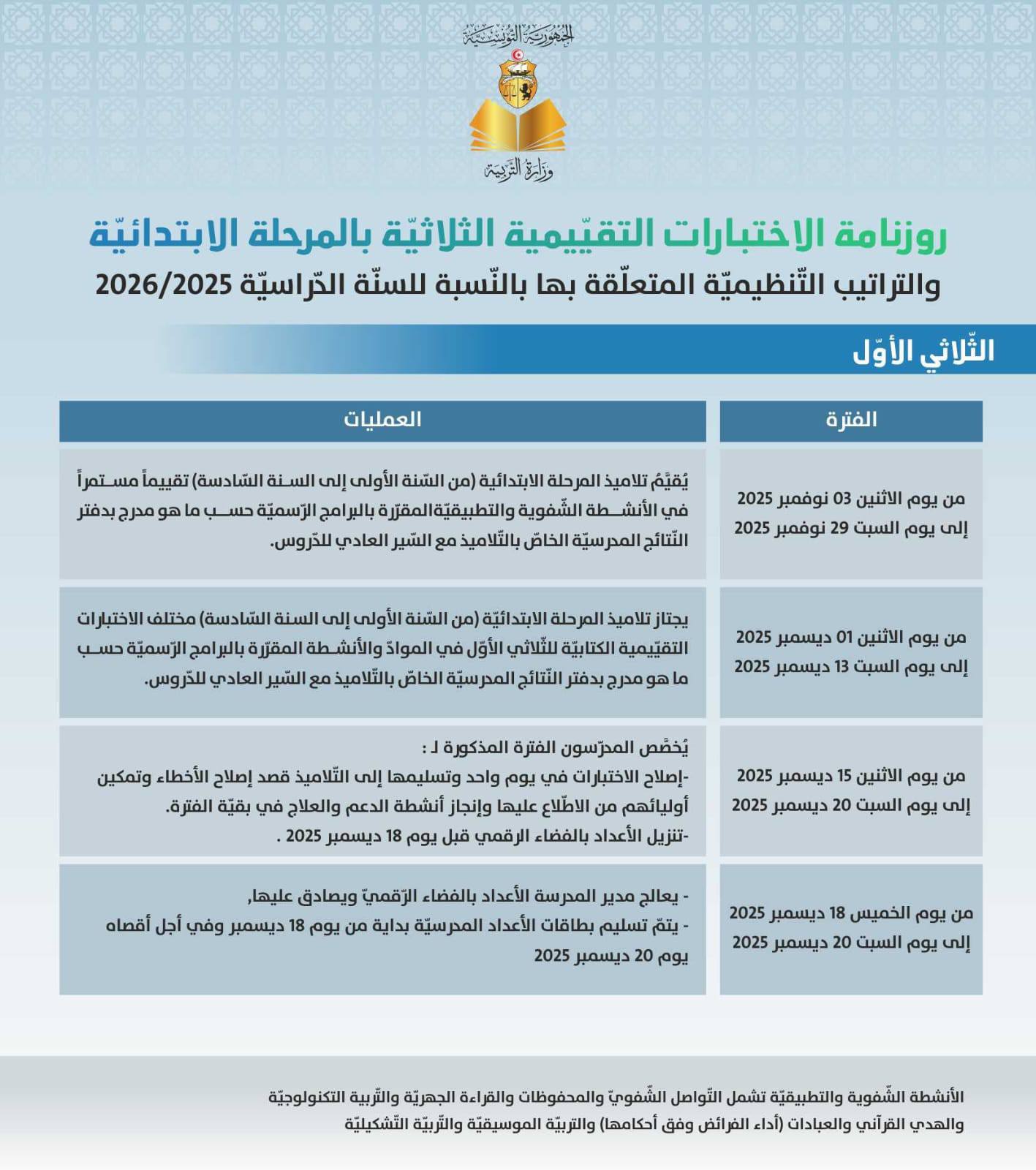 وحسب ما أوردته الوزارة، فإن التقييمات الشفوية والتطبيقية للثلاثي الأول تنطلق يوم 3 نوفمبر 2025 وتتواصل إلى غاية 29 من نفس الشهر، على أن تنطلق الاختبارات الكتابية يوم 1 ديسمبر المقبل وذلك إلى غاية 13 ديسمبر.