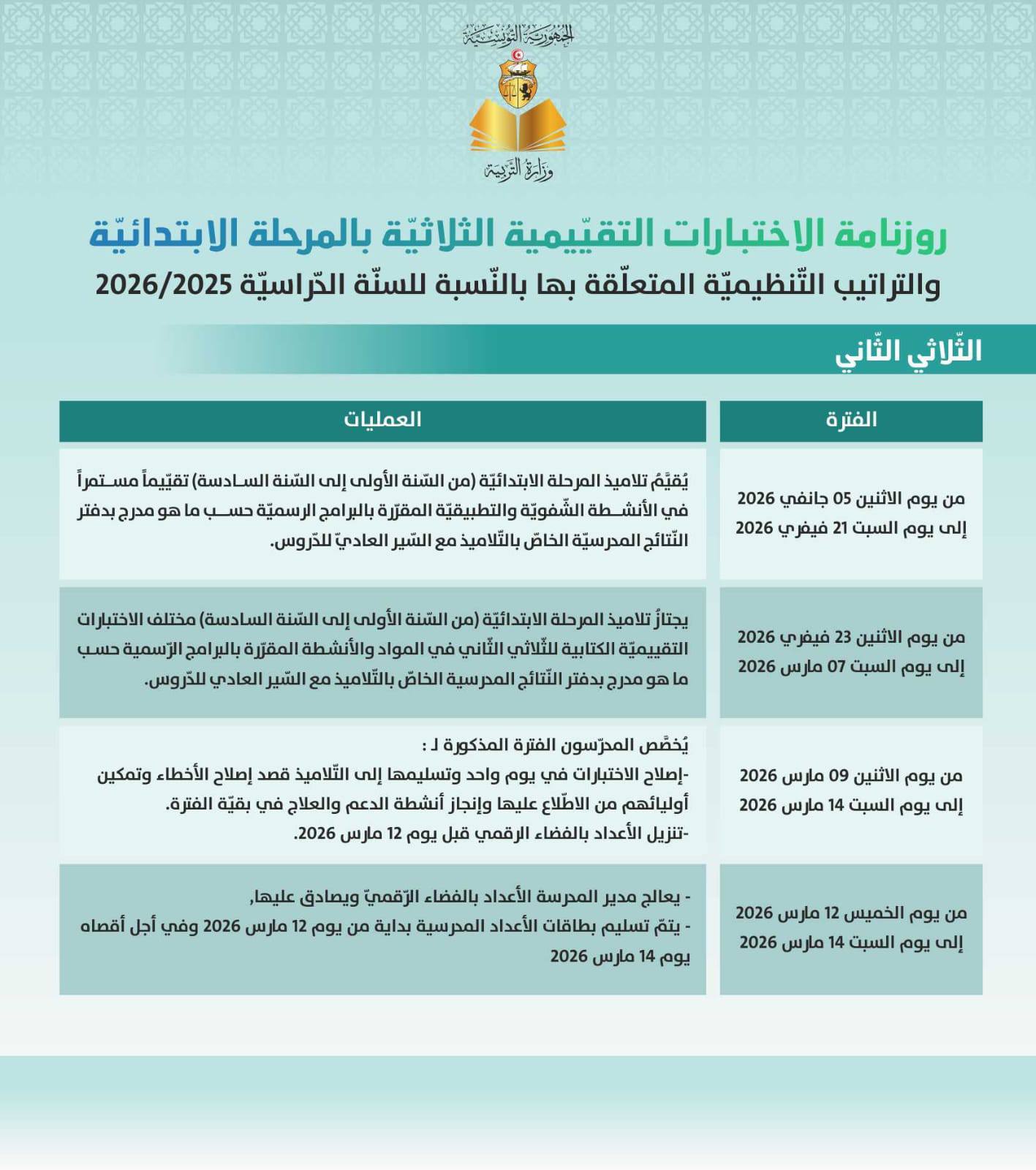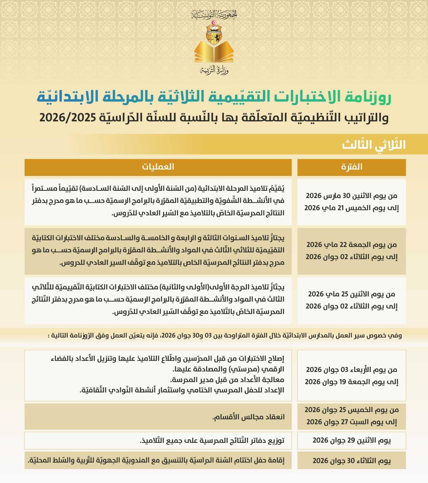 نشرت وزارة التربية صباح اليوم الجمعة 24 أكتوبر 2025، تفاصيل رزنامة الاختبارات التقييمية الثلاثية بالمرحلة الابتدائية للسنة الدراسية 2025-2026.