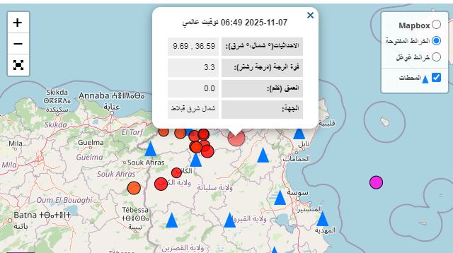 سجلـت محطـات رصـد الزالزل التابعـة للمعـهـد الوطنـي للرصـد الجوي رجة أرضية، اليوم الجمعة 7 نوفمبر ،2025 علـى الساعــة 07 و 49 دقيقة (بالتوقيت المحلي)، بلغت قوتهـا 3 فاصل 3 درجة علـى سلـم ريشتـر.