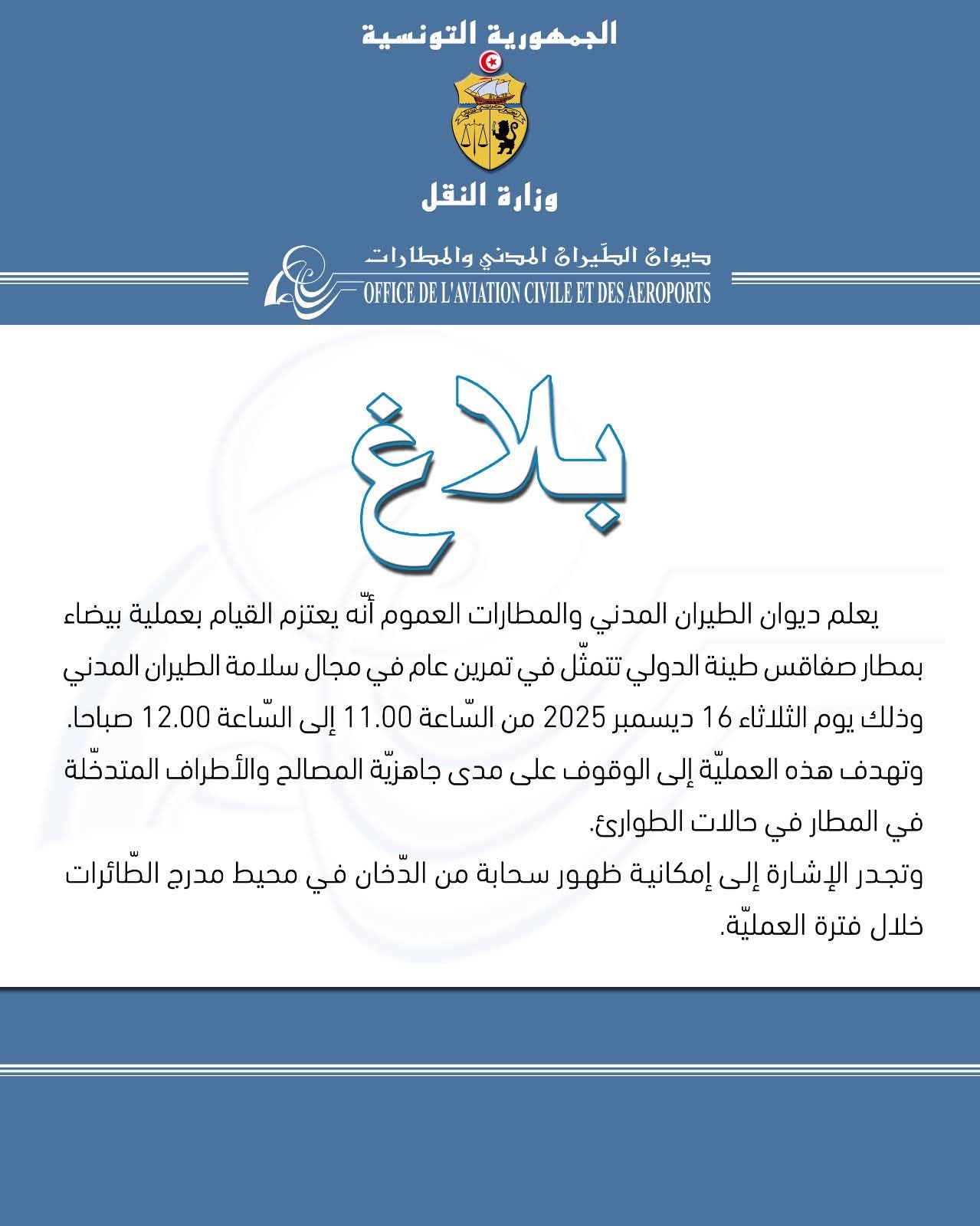 أعلن ديوان الطيران المدني والمطارات القيام بعملية بيضاء بمطار صفاقس طينة الدولي تتمثل في تمرين عام في مجال سلامة الطيران المدني وذلك اليوم الثلاثاء 16 ديسمبر 2025 من الساعة 11.00 إلى الساعة 12.00 صباحا.