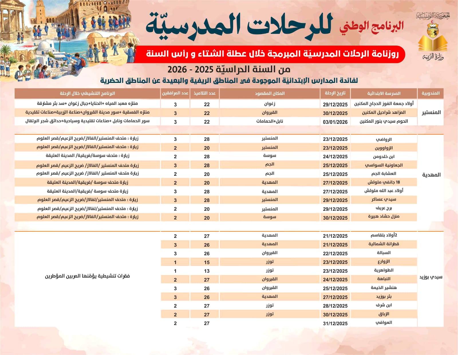 وانطلق البرنامج يوم أمس اأحد ليتواصل إلى يوم 4 جانفي 2026، حيث سيتم تنظيم 11 رحلة إلى العديد من المناطق الأثرية والسياحية بولايات القيروان والمهدية وتوزر، تشتمل فقرات تنشيطية يؤمنها المربون والمرافقون للرحلات.