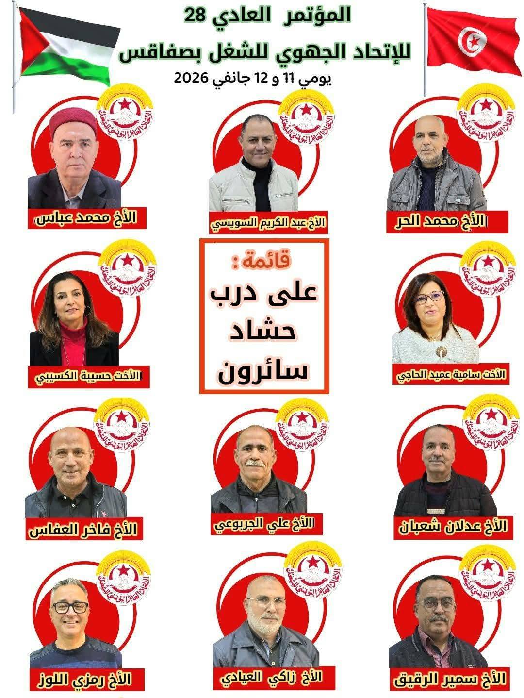 انتهت مساء امس الاثنين 12 جانفي 2026 اشغال المؤتمر العادي 28 للاتحاد الجهوي للشغل بصفاقس بانتخاب أعضاء المكتب التنفيذي الجديد المتكون من محمد عباس-محمد الحر-زاكي العيادي- سمير الرقيق- حسيبة الكسيبي-عبد الكريم السويسي-عدلان شعبان-علي الشايب الجربوعي-سامية عميد الحاجي-رمزي اللوز-فاخر العفاس