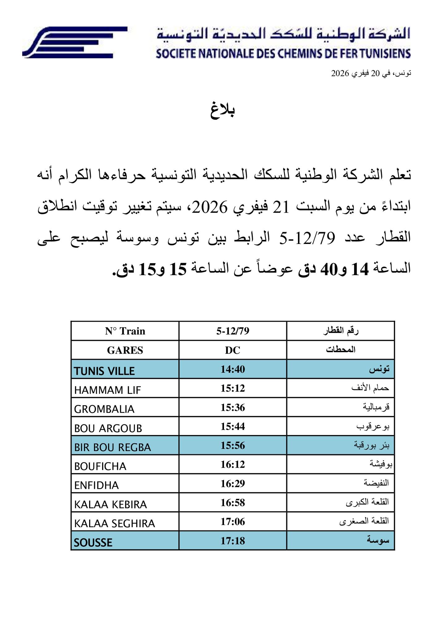 أفادت الشركة الوطنية للسكك الحديدية التونسية، بأنه سيتم بداية من يوم غد السبت 21 فيفري 2026، تغيير توقيت انطلاق القطار عدد 12/79-5- الرابط بين تونس وسوسة ليصبح على الساعة 14 و40 دق عوضاً عن الساعة 15 و15 دق.