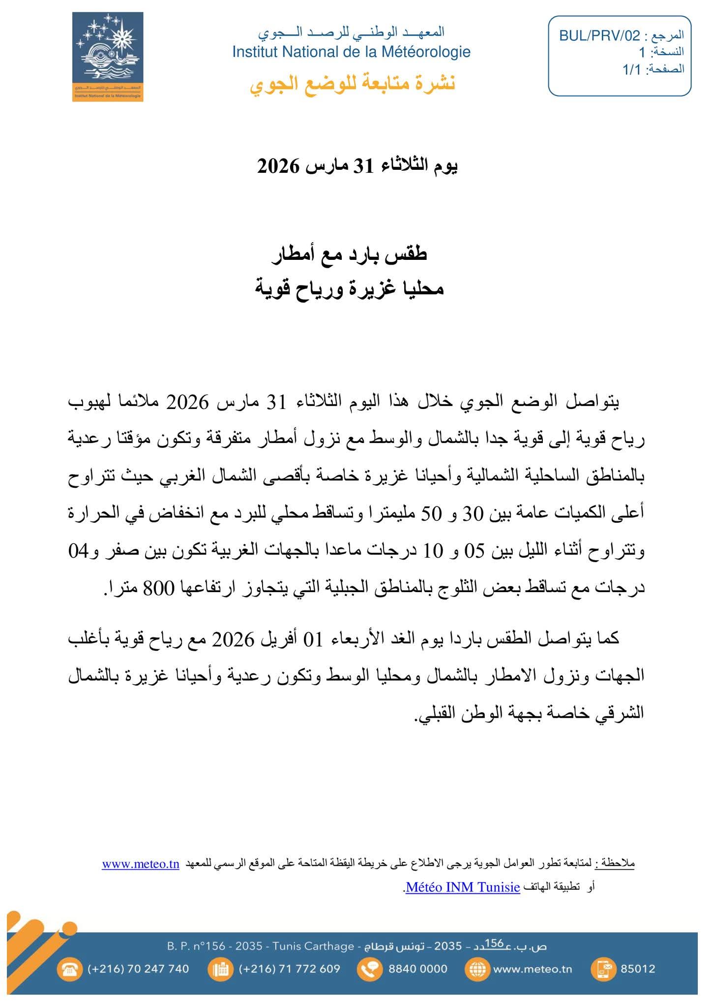 أصدر المعهد الوطني للرصد الجوي صباح اليوم الثلاثاء 31 مارس 2026، نشرة متابعة، أكد فيها أن الوضع الجوي يتواصل خلال هذا اليوم ملائما لهبوب رياح قوية إلى قوية جدا بالشمال والوسط مع نزول أمطار متفرقة وتكون مؤقتا رعدية بالمناطق الساحلية الشمالية وأحيانا غزيرة خاصة بأقصى الشمال الغربي.